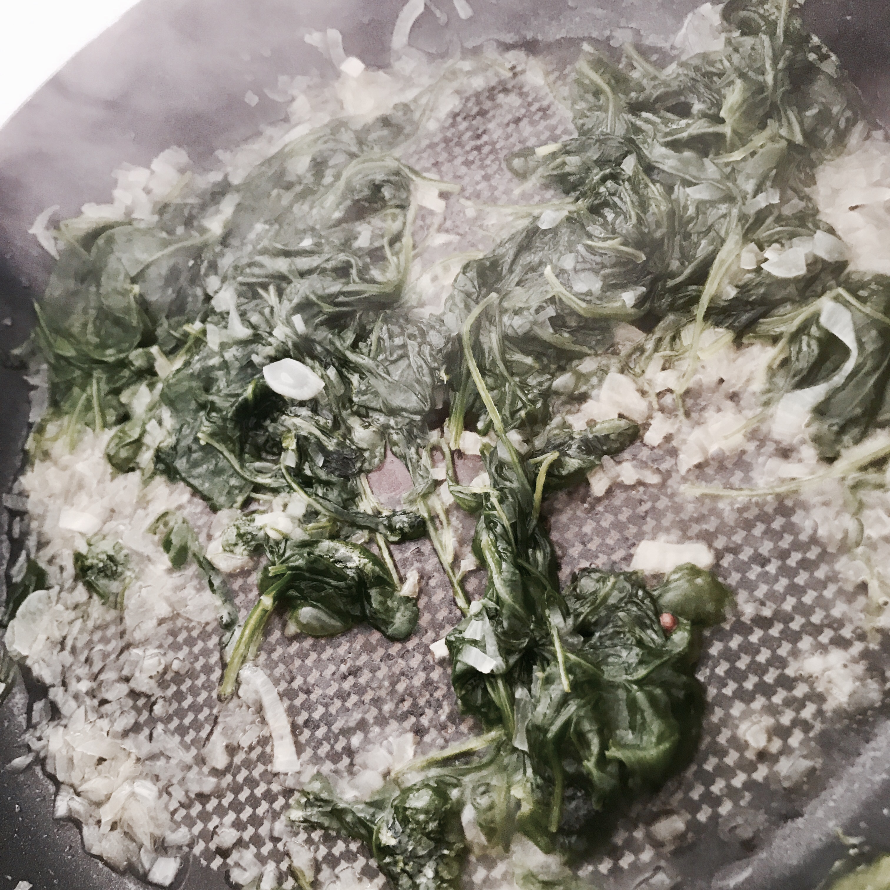 Die Zwiebel sehr sehr fein schneiden und mit etwas Olivenöl dünsten, anschliessend den gewaschenen Spinat dazugeben, salzen und in sich zusammenfallen lassen.