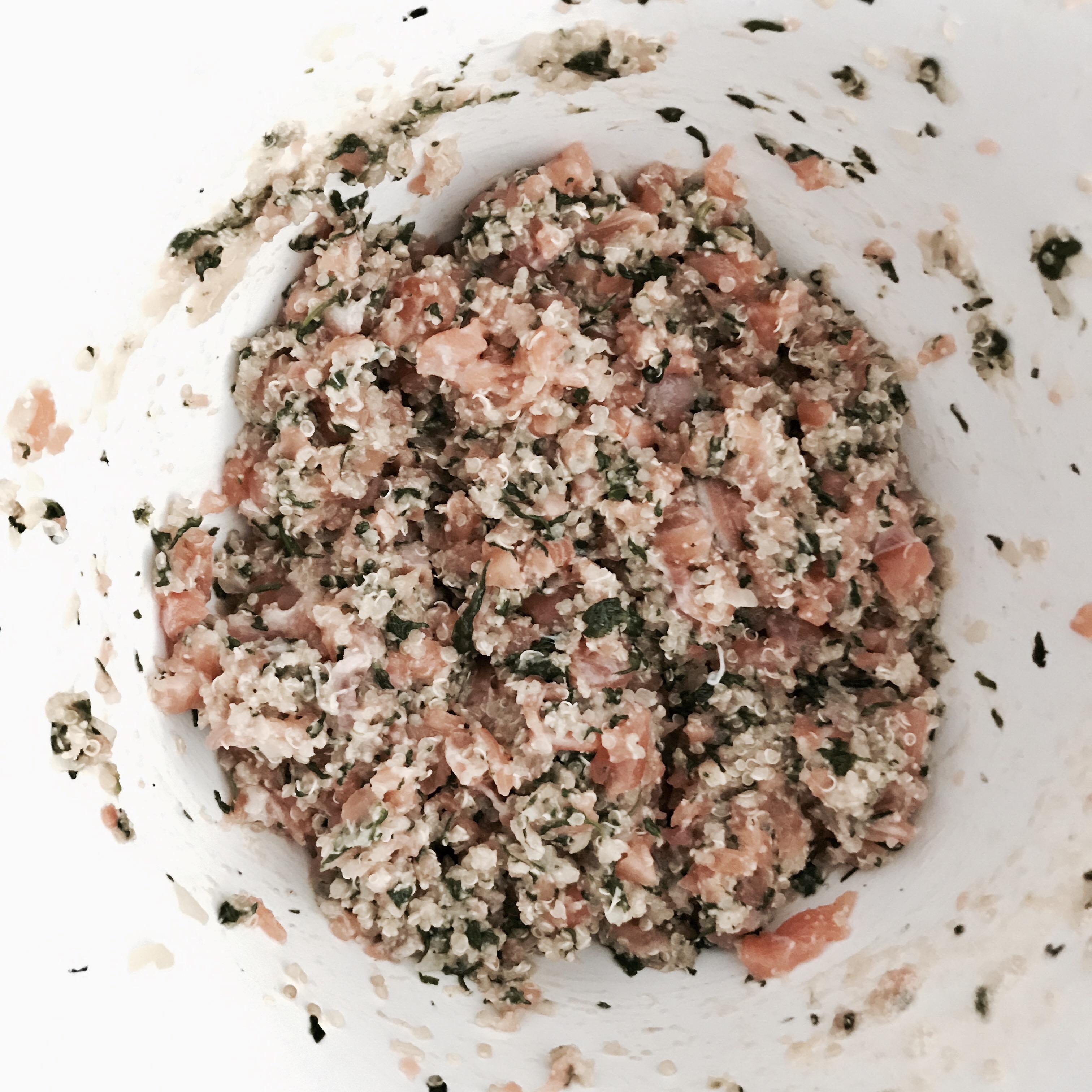 Nun den Spinat ebenfalls fein hacken und mit der gekochten Quinoa zum Lachs geben.