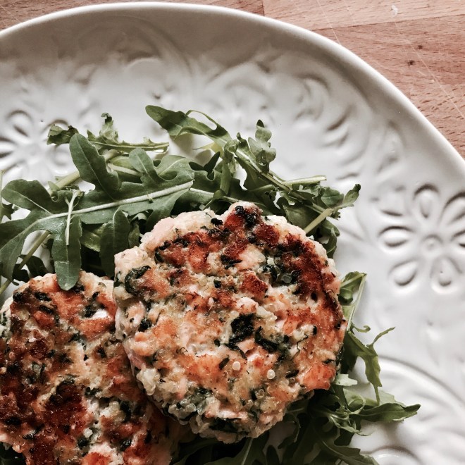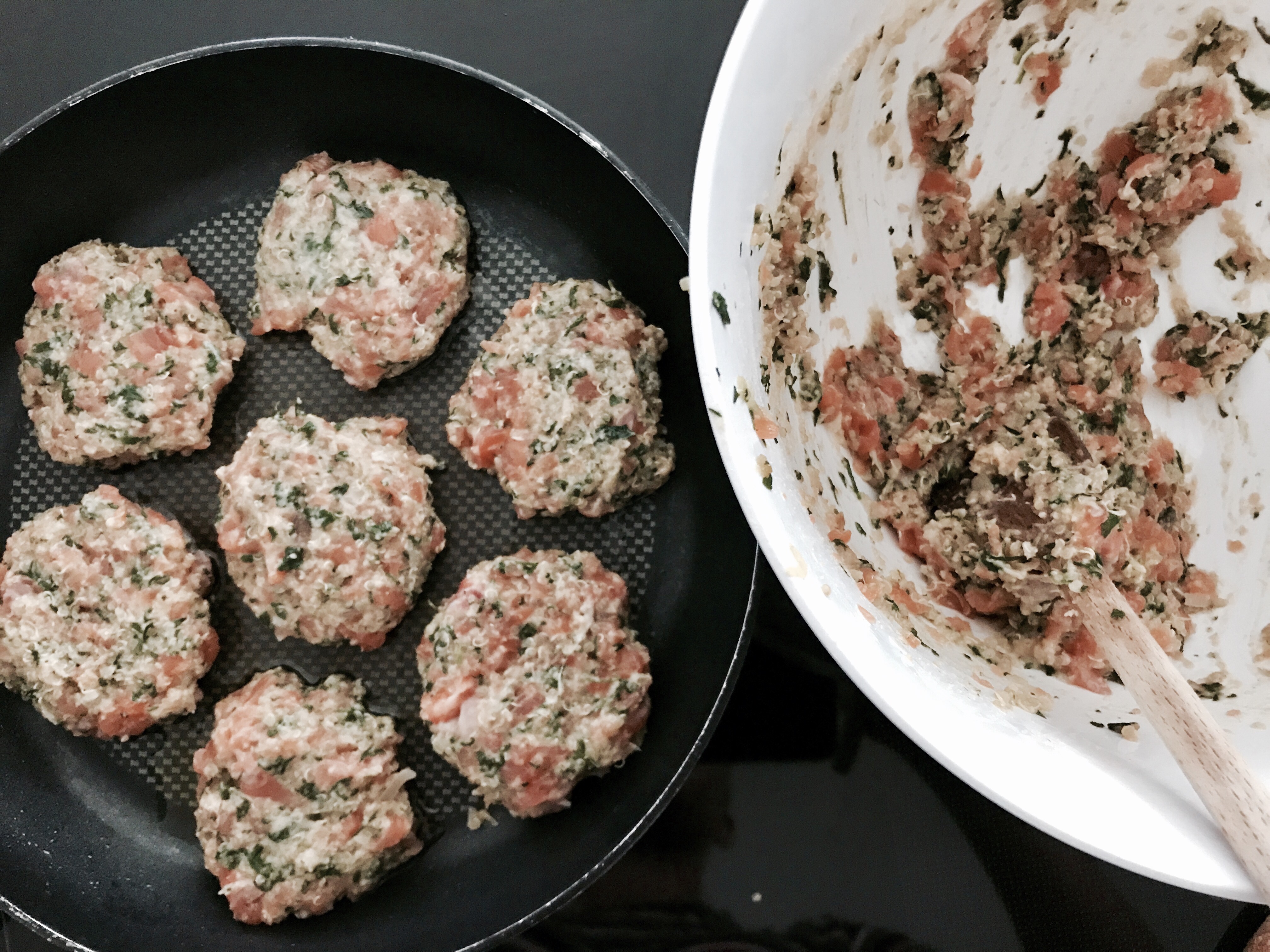 Die Lachsburger mit nassen Händen formen und in einer beschichteten Pfanne mit Olivenöl beidseitig bei mittlerer Hitze braten.