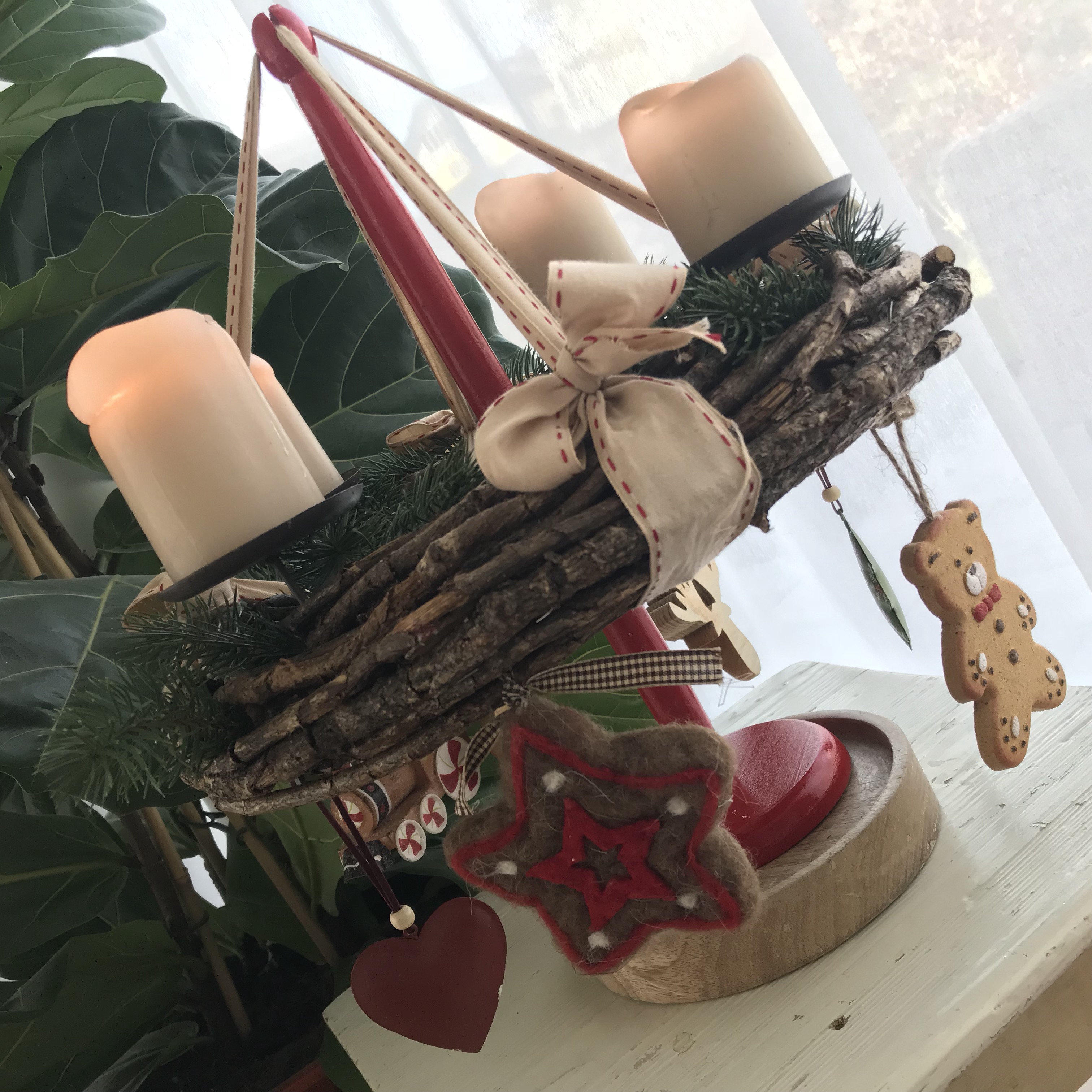 Den Kranz habe ich mit einigen kleinen Tannenzweigen dekoriert und mit verschiedenen hübschen Weihnachtsanhänger vervollständigt.