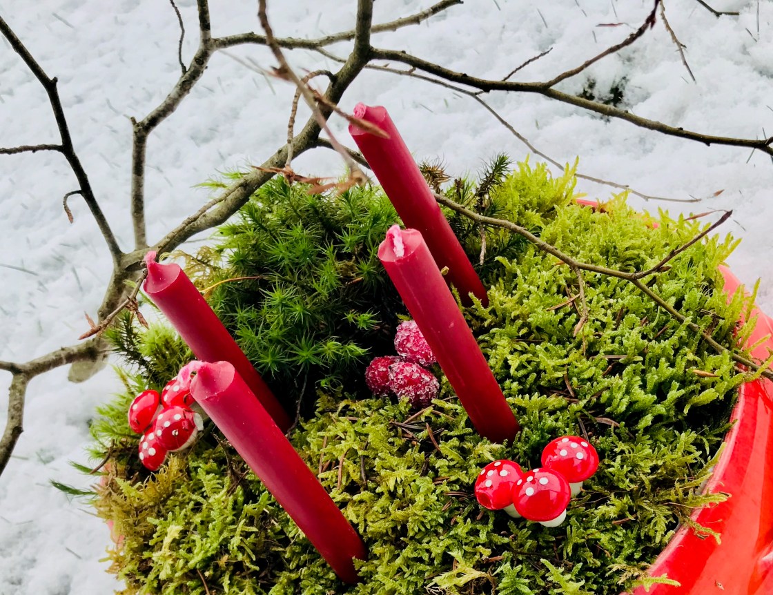 Auf das Moosbeet habe ich 4 rote Christbaumkerzen mit einem Stück Draht befestigt und einige kleine Fliegenpilze… ein kleines Stück magischer Wald für unsere Weihnachtszeit.