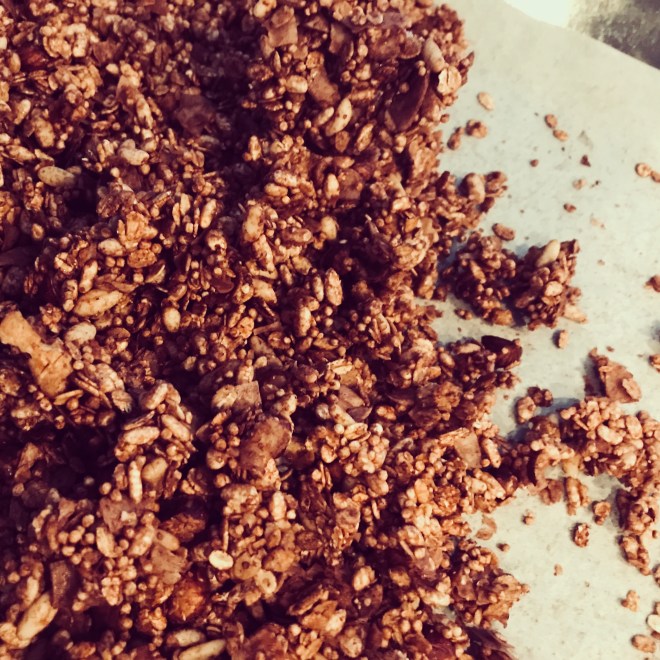 Alle Zutaten in einer Schüssel gut durchmischen, sodass der Honig und das Kokosfett gut verteilt werden.
