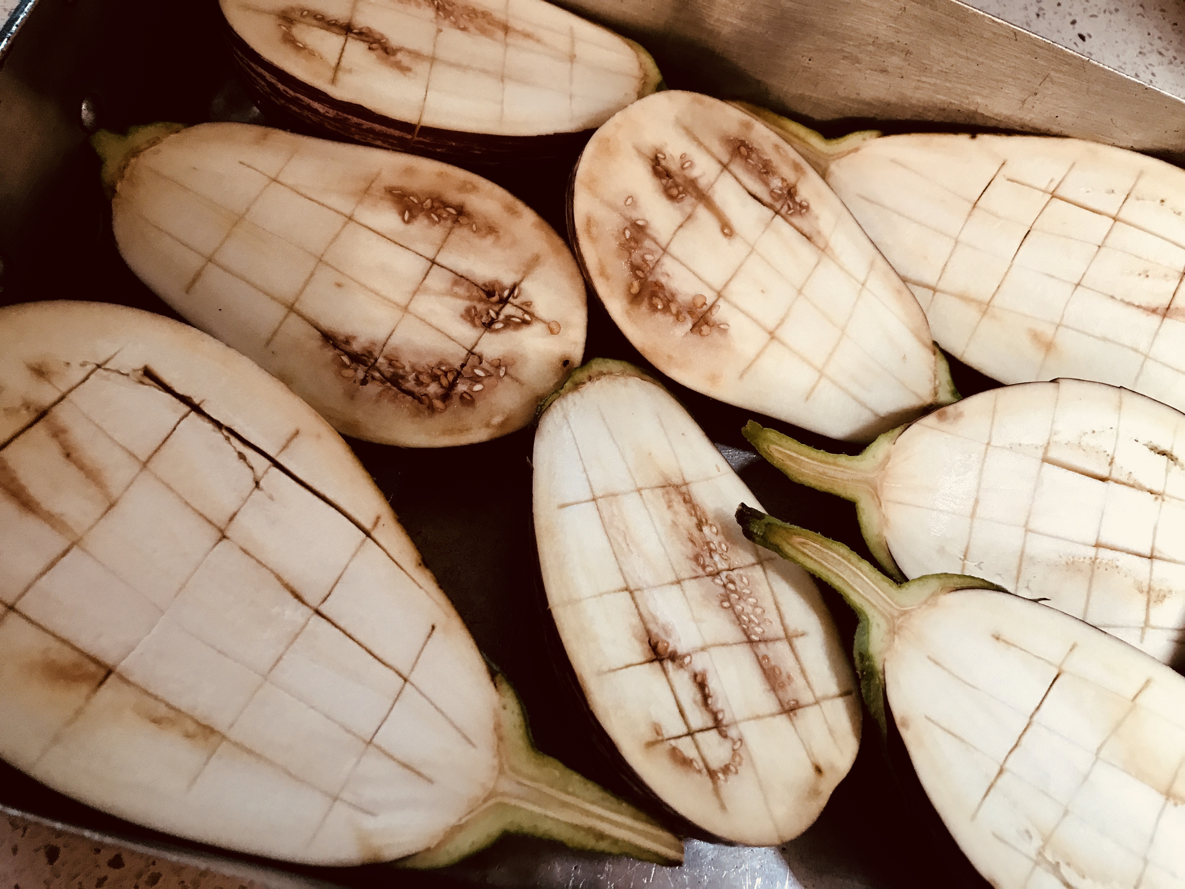 Die Melanzane halbieren und rautenförmig einschneiden ohne die Schale zu durchbrechen.