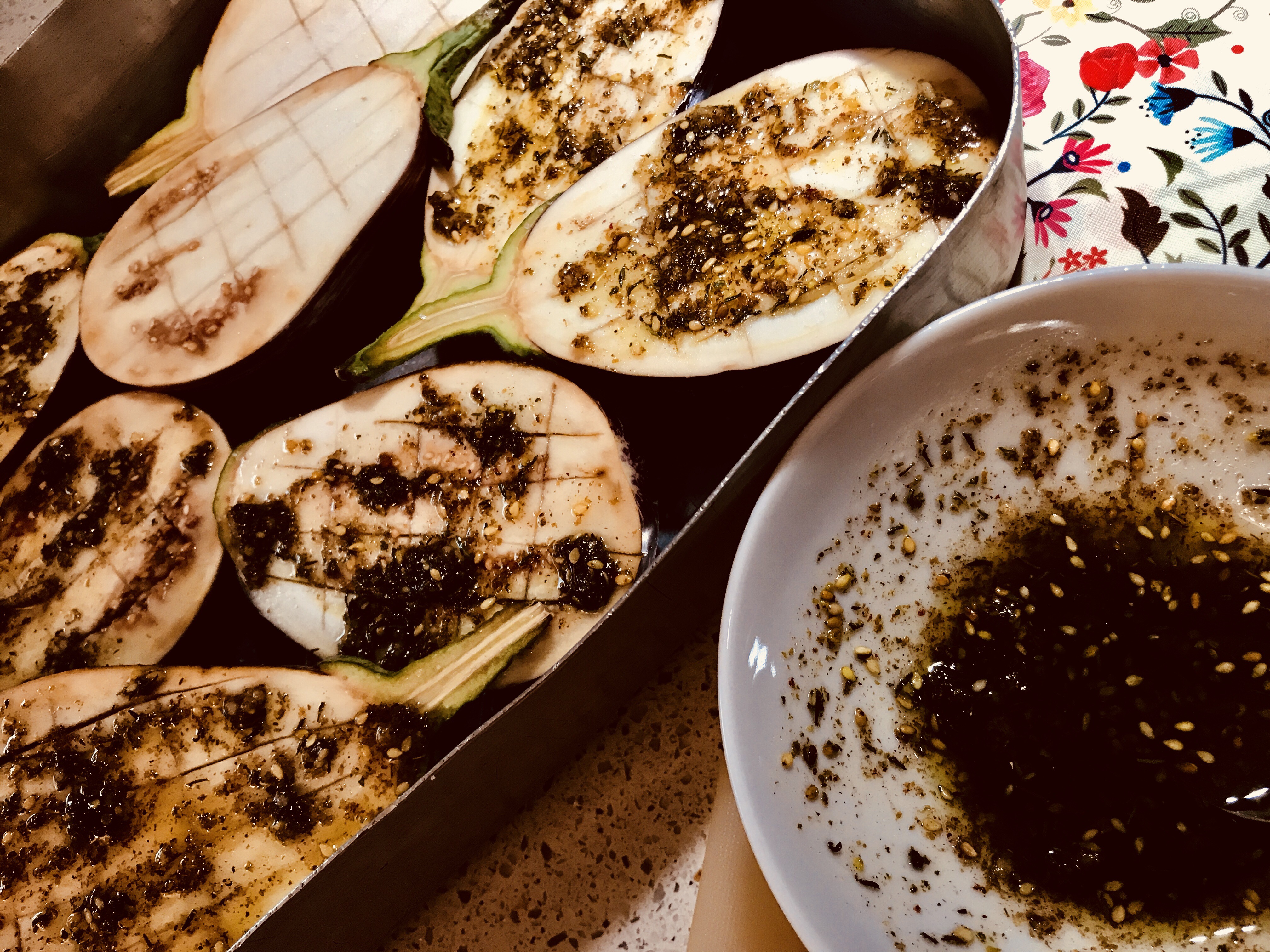 Anschliessend ein halbes Glas Olivenöl, 2-3 Esslöffel Z‘atar, 1 Teelöffel Honig und eine zerquetschte Knoblauchzehe gut verrühren und damit die Melanzanihälften gut einreiben.