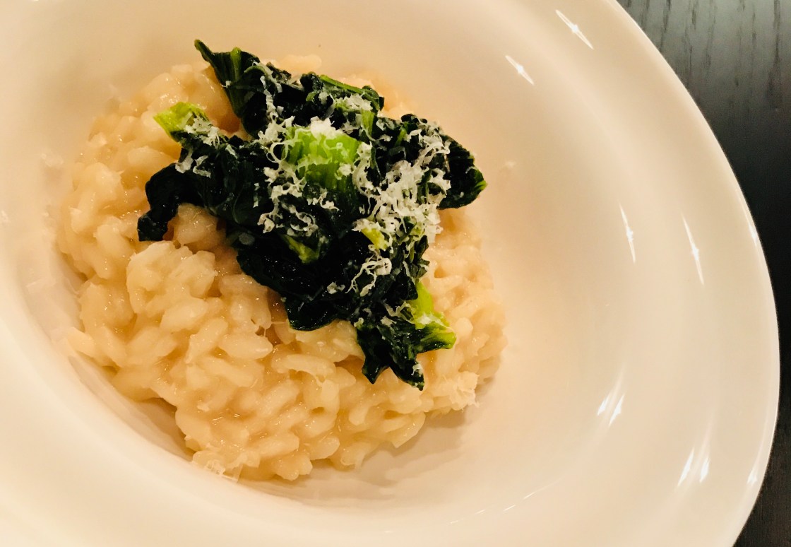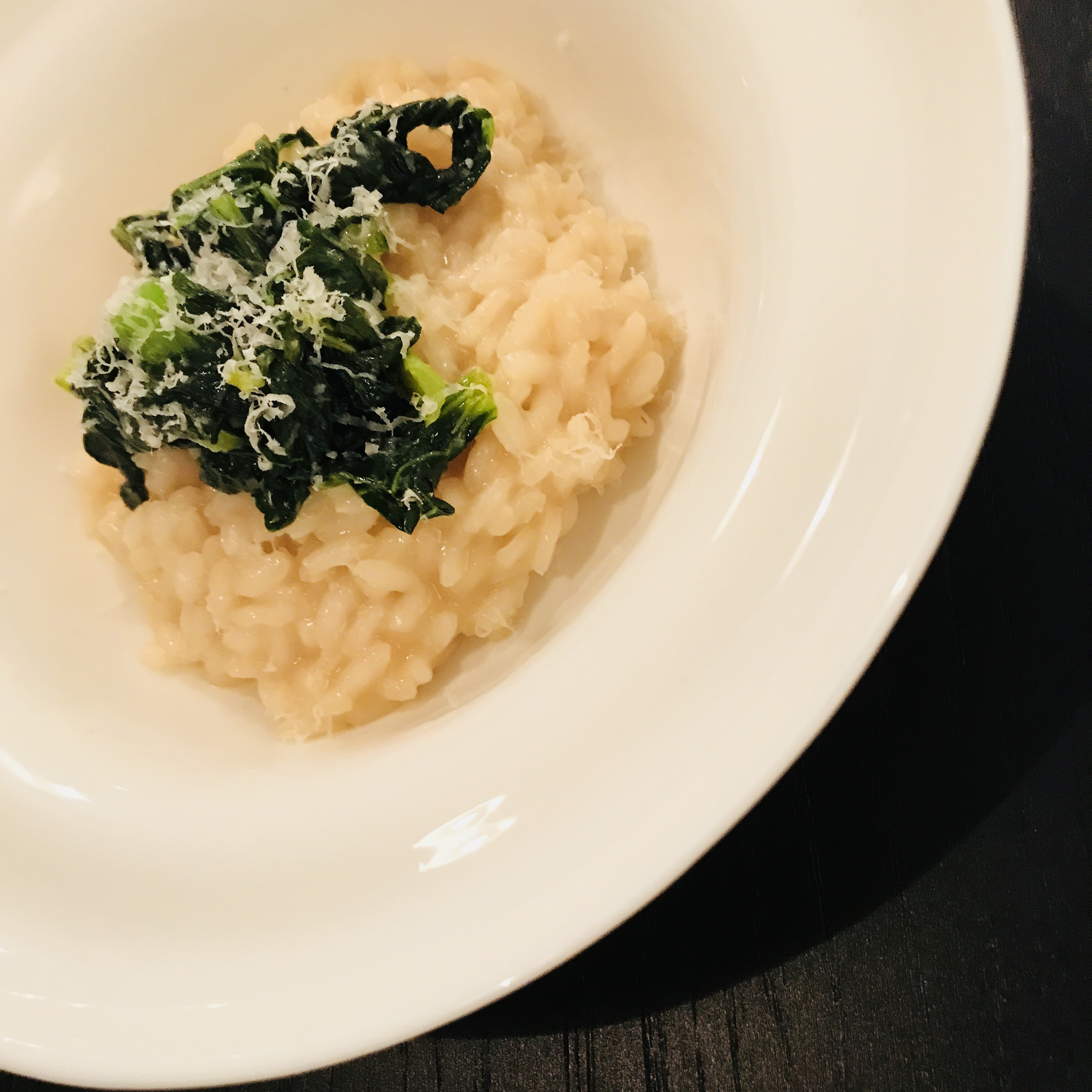 Den Risotto sofort in die Teller geben und mit etwas Mangold obendrauf verfeinern.