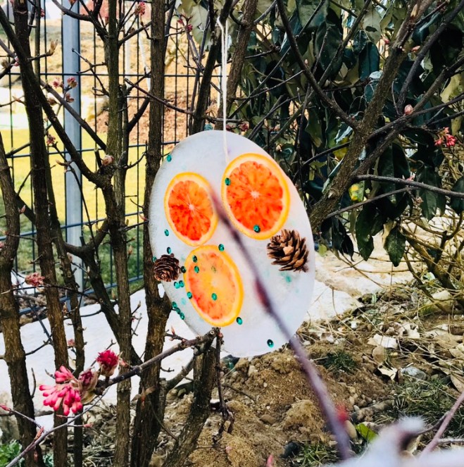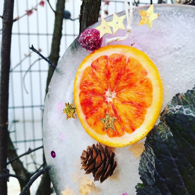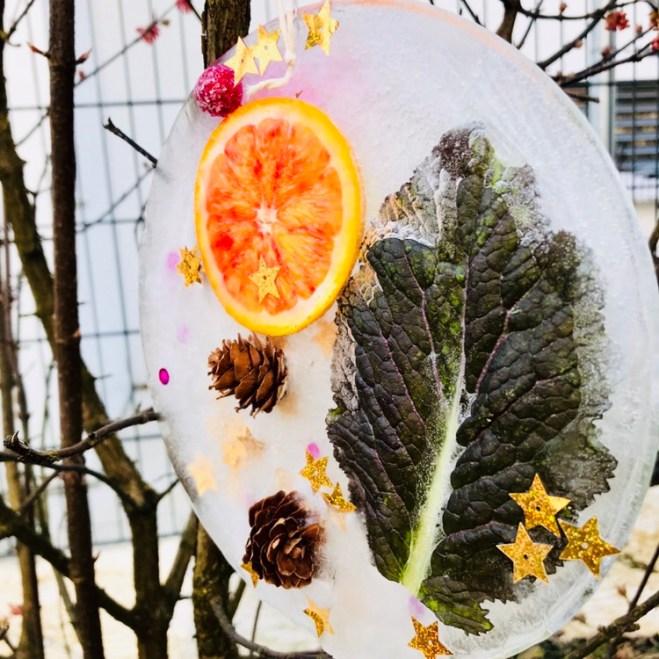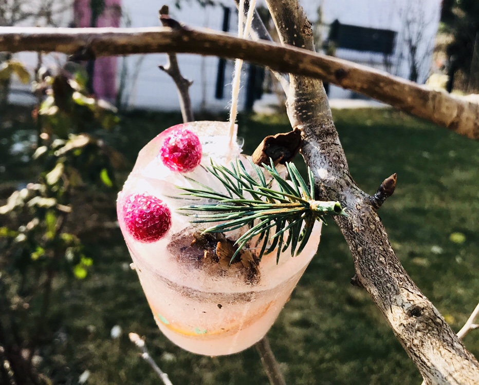 Die gefrorenen Anhänger von den Behältern lösen und damit die Sträucher und Bäume im eigenen Garten schmücken.