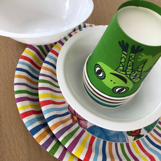Nun die einzelnen Elemente in den Schalen, Tellern und Bechern legen und je einen zur Schlaufe gebundenen Faden dazugeben.