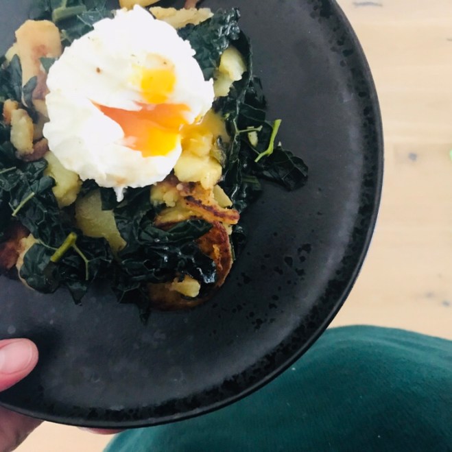 In einer zweiten Pfanne einen Esslöffel Butter (Olivenöl für 🌱) schmelzen lassen und die in Scheiben geschnittenen Kartoffeln darin goldig braun rösten. In den letzten 5 Minuten den Palmkohl und ide Pastinaken darunterheben und nochmal mit Salz nachwürzen.