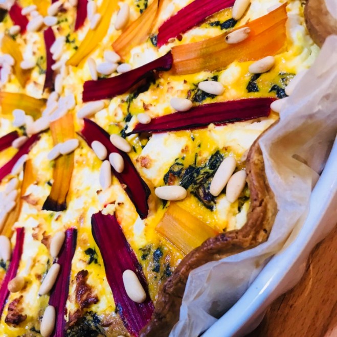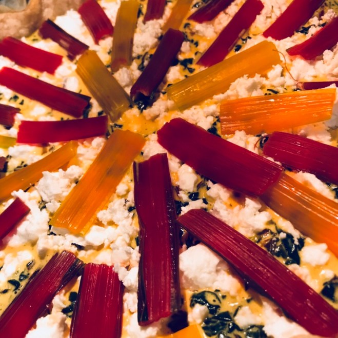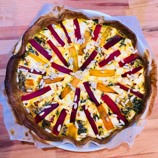 Den Mangold mit dem Guss vermischen und in die vorgebackene Quicheschale geben und mit den bunten Stielen verzieren.