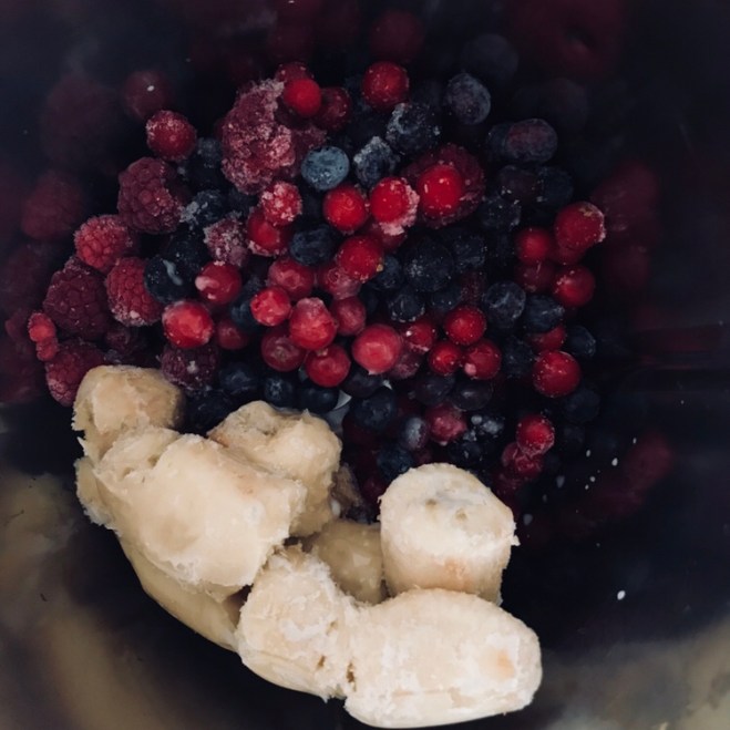 Solltet ihr einen Stabmixer benützen die Bananen und Beeren dementsprechend länger antauen lassen.