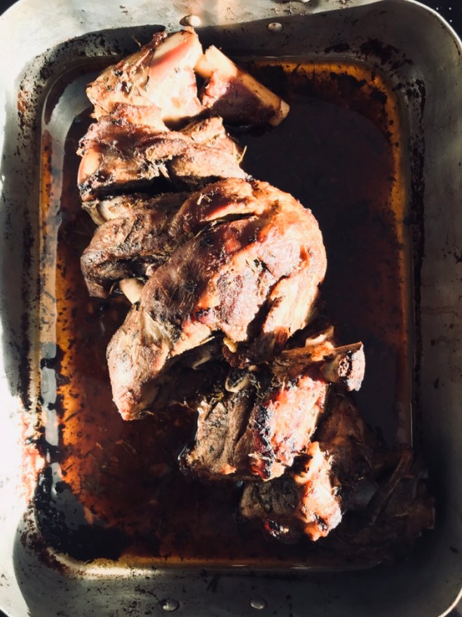 Das Lamm anschliessend mit dieser Marinade grosszügig einreiben. Im vorgeheiztem Ofen bei 230 Grad Umluft oder bei mir Grill mit Umluft Funktion ca. 20 Minuten mit der Schwarte nach oben braten.