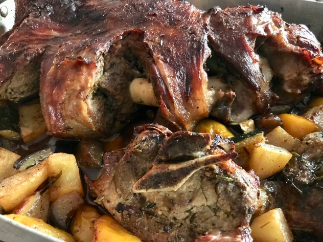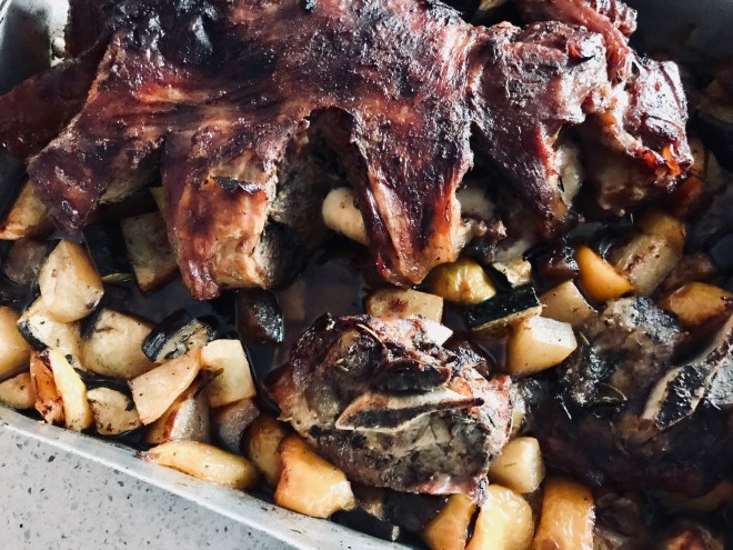 Das Gemüse im Ofen bei 200 Grad ca. 0.5 – 1 Stunde weichgaren, die letzten 15 Minuten nochmals das Fleisch auf das Gemüse setzen und wärmen.