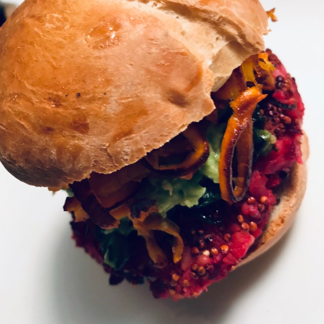 Ich habe die Patties mit Burgerbuns, Avocadocreme und knusprigen Süsskartoffelchips serviert.