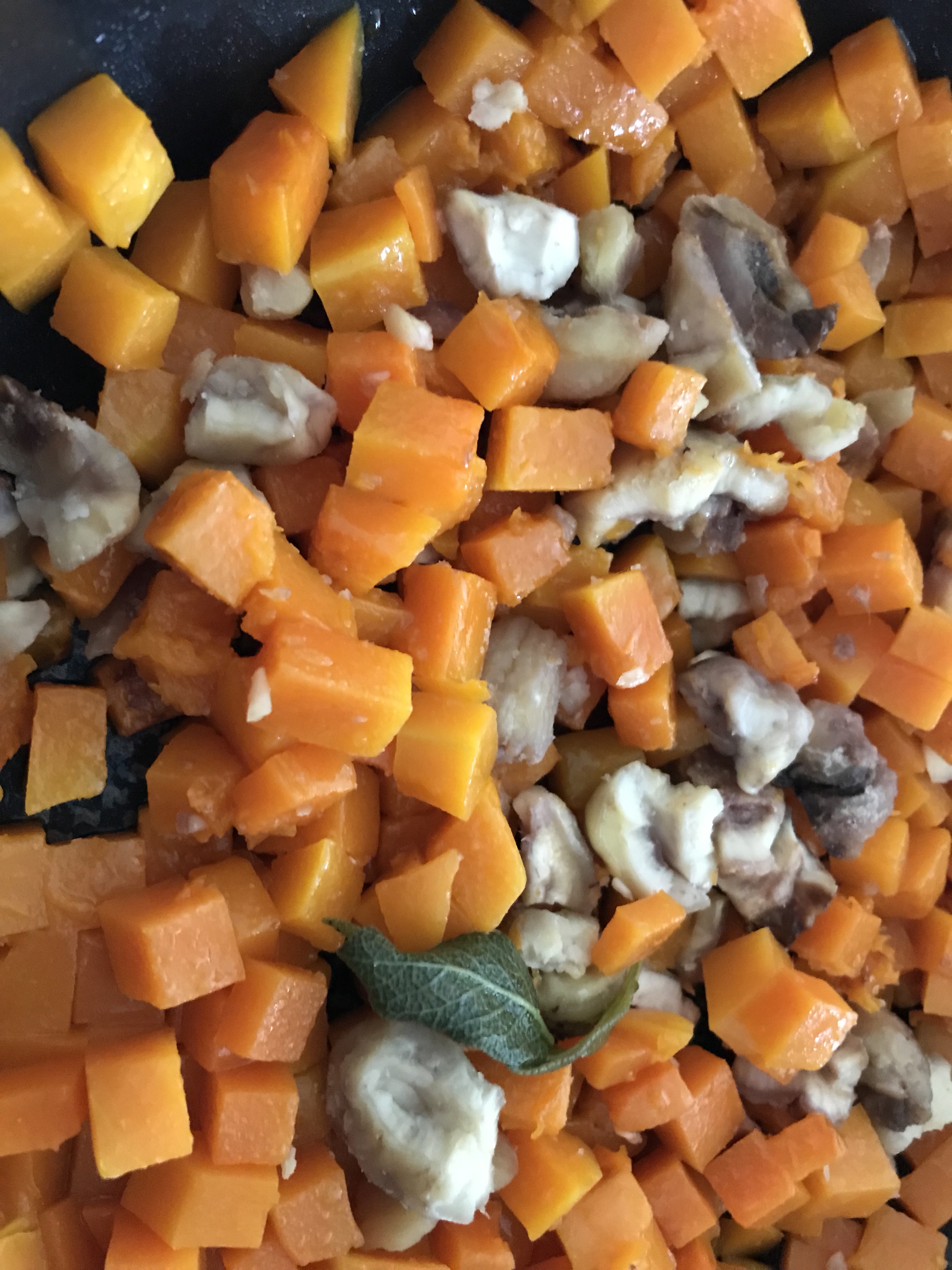 Den Kürbis würfeln und zusammen mit den gekochten Kastanien mit etwas Butter und Salz weichdünsten.