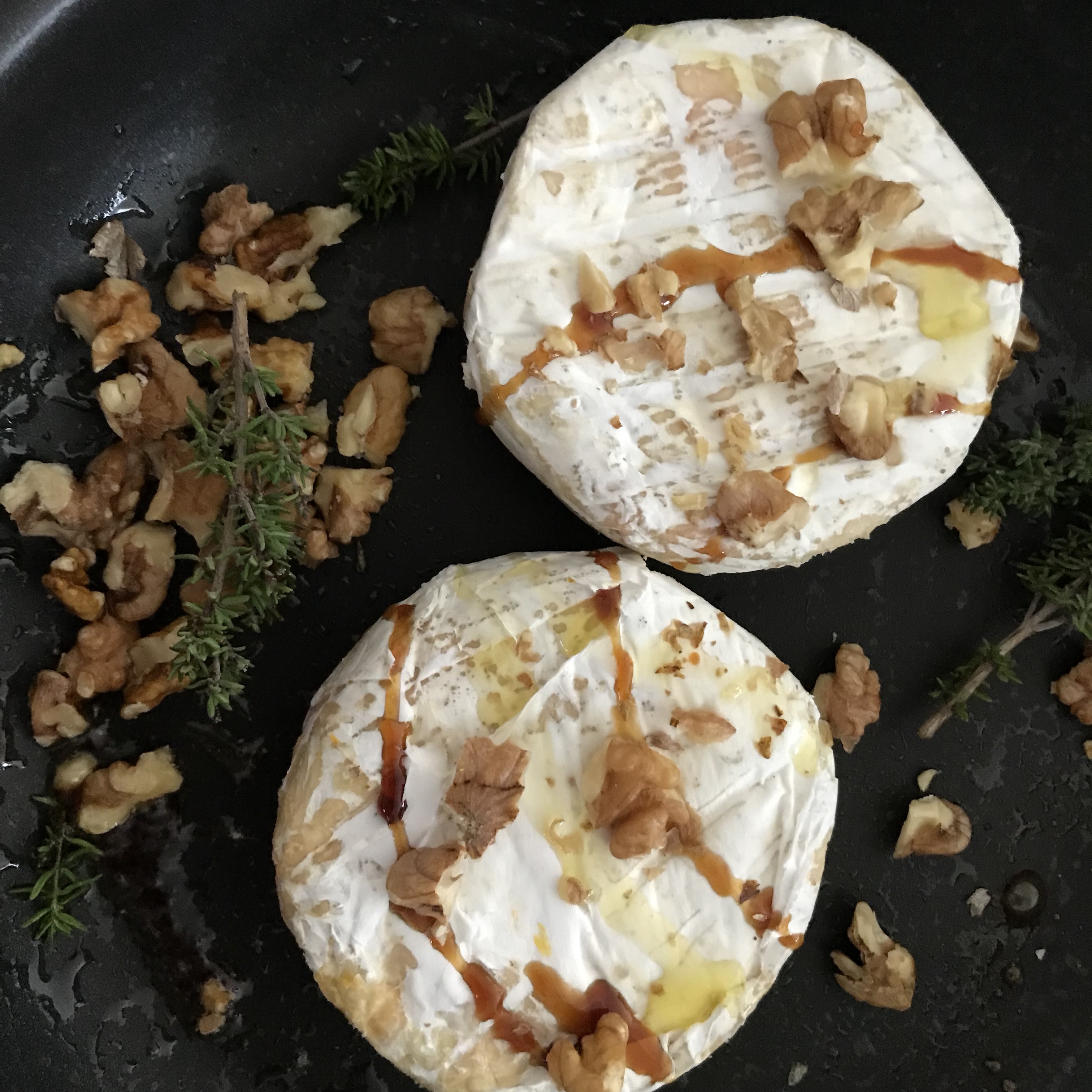 In der Zwischenzeit den Käse in einer antihaft beschichteten Pfanne mit etwas Olivenöl, den Thymianzweigen und Dattelsirup wärmen bis der Kern cremig verläuft.
