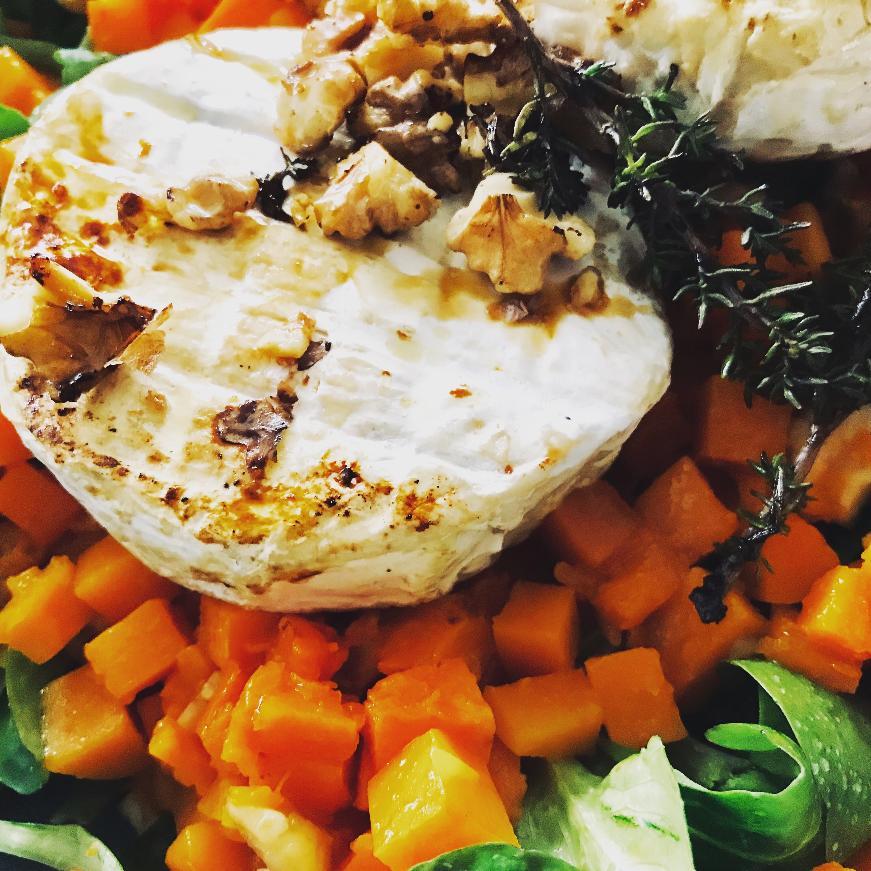 Den Salat waschen, mit einem Olivenöldressing würzen, und mit der Kürbis Maroni Mischung und den Walnüssen bestreuen. Zum Schlussden warmen Käse dazugeben.