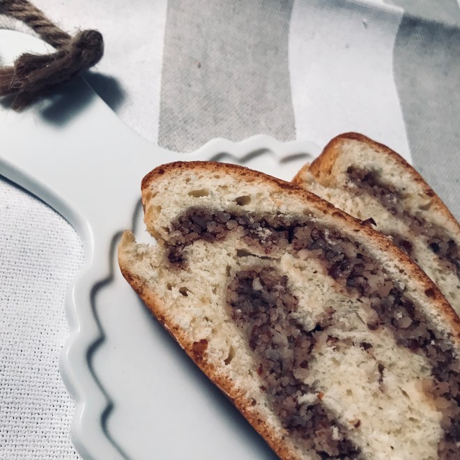 Sobald der Teig sich verdoppelt hat ihn auf dem Backpapier leicht zu einen Rechteck ausseinanderziehen und mit der Nussfüllung bestreichen. Mit Hilfe des Backpapiers zum Strudel aufrollen, mit etwas Ei bestreichen und bei 160 Grad Umluft goldbraun ca. 40 Minuten backen.