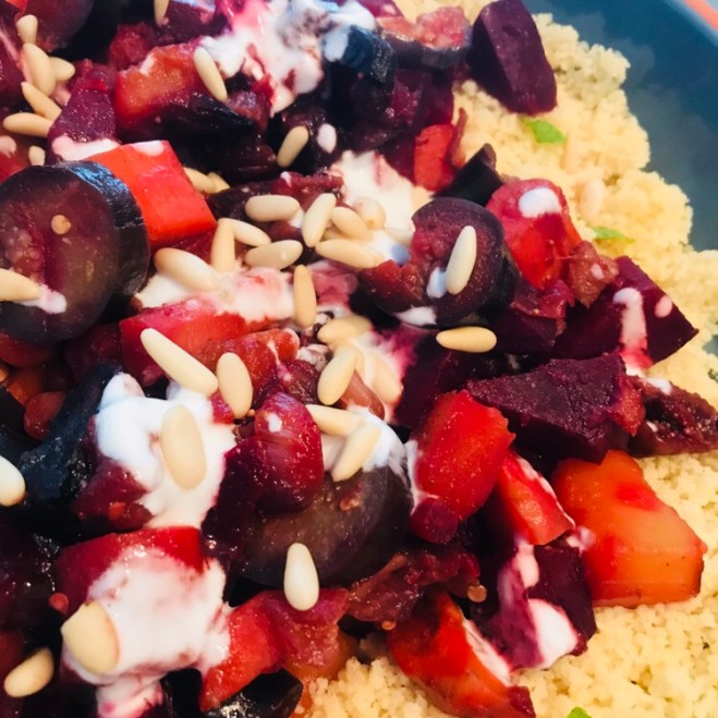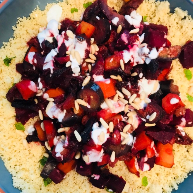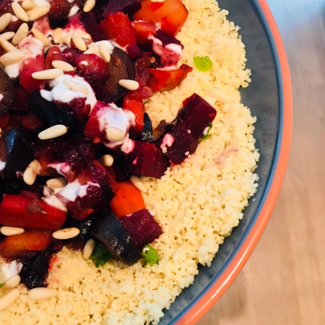 Das Gemüse zum Schluss mit frischen Minzblättern verfeinern und mit dem Couscous und etwas Naturjoghurt servieren.