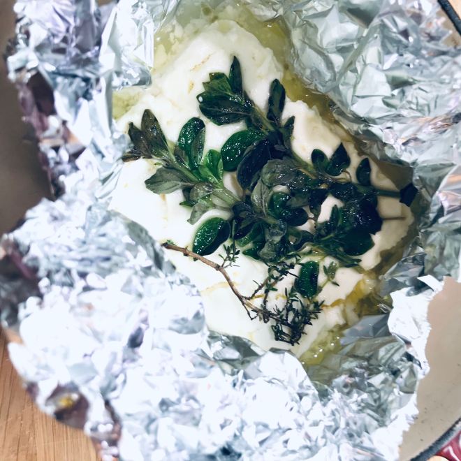 Den Feta nun mit Olivenöl und dem Honig betreufeln, mit den frischen Kräutern belegen und die Folie zu einem Päckchen falten.