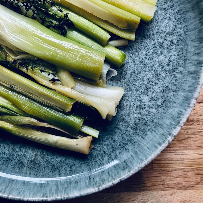 1 Teelöffel Butter und etwas Öl wärmen und die gewaschenen und halbierten Lauchstangen zusammen mit den Thymianzweigen darin rundherum wenden.