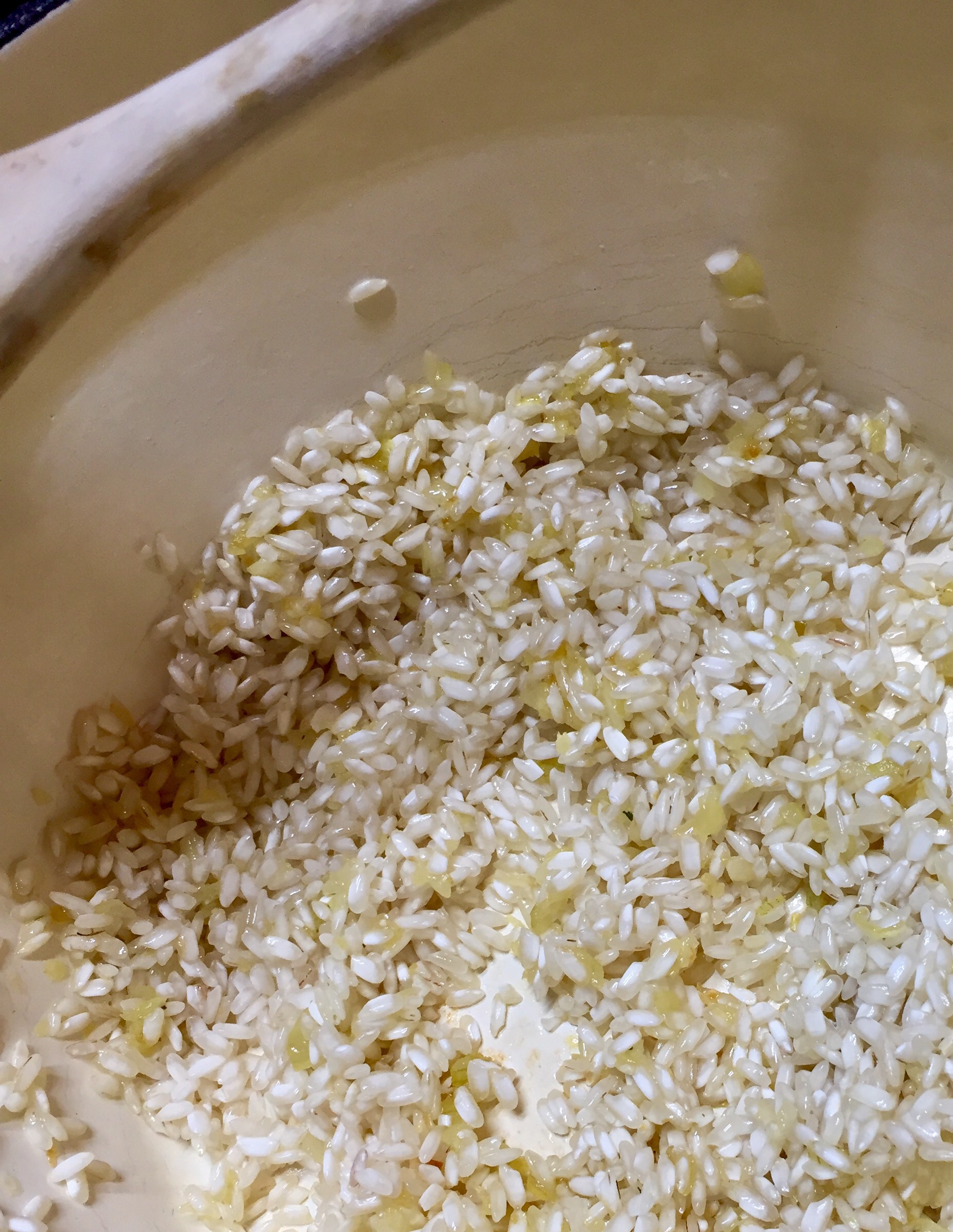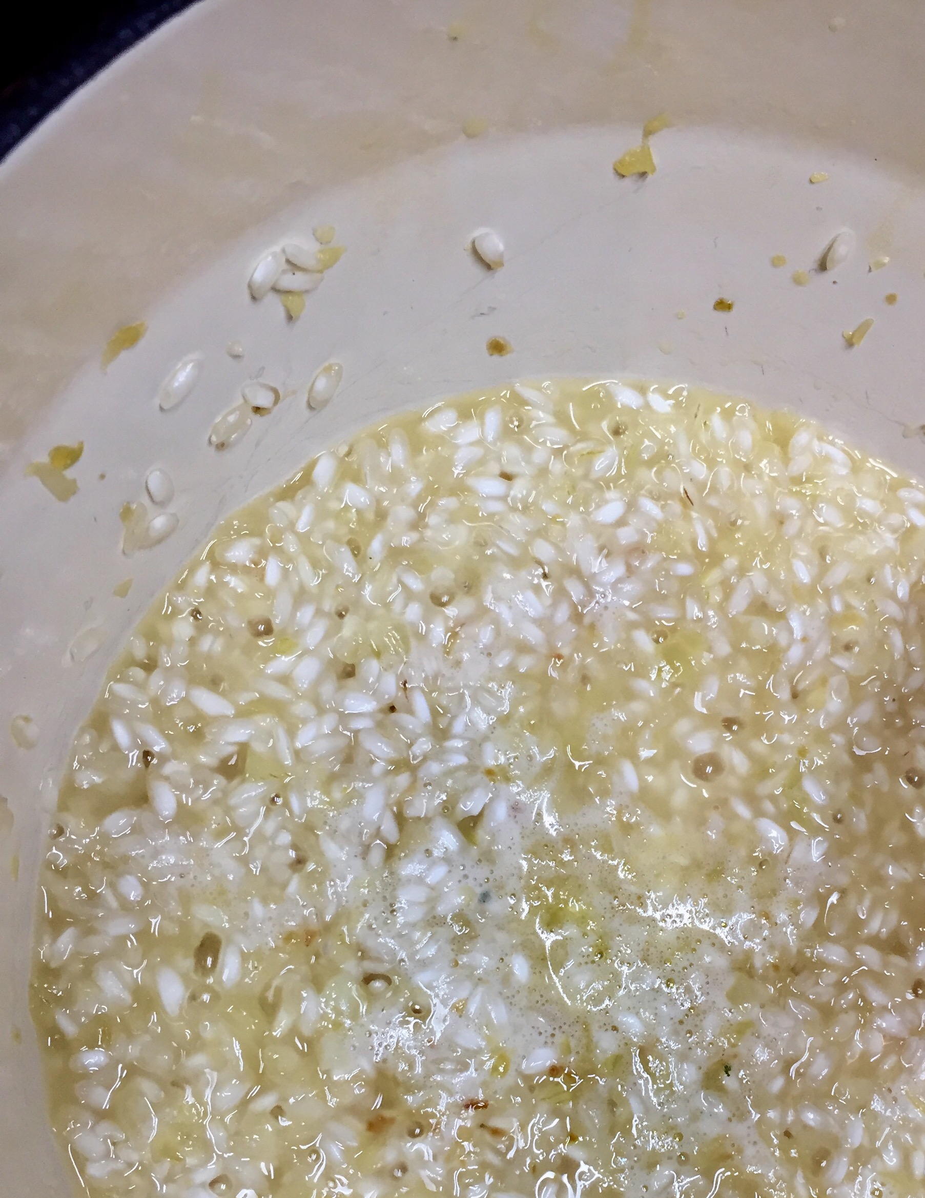 Die Zwiebel sehr fein schneiden und in Olivenöl langsam weichdünsten. Risottoreis dazugeben und glasig toasten, mit Weisswein löschen und gut einkochen lassen.