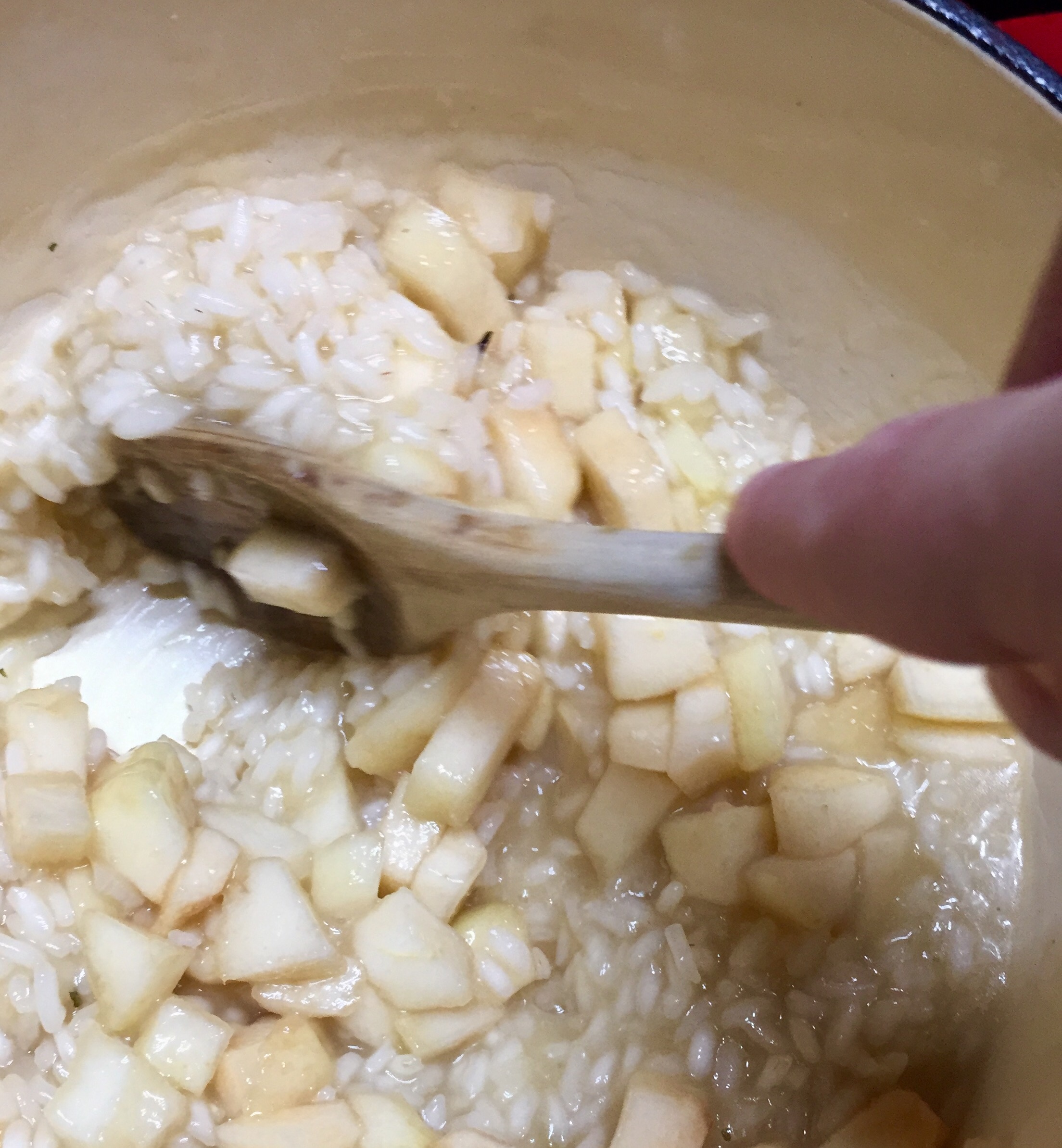 Kurz bevor der Reis fast fertig ist das Birnenpüree, die gewürfelte Birne und den Appenzeller dazugeben und solange unterrühren bis der Letztere geschmolzen ist.