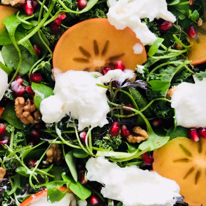 Nun Persimone gut waschen und in feine Scheiben schneiden. Diese anschliessend zusammen mit den Nüssen und den Granatapfelkernen auf dem Salat verteilen.