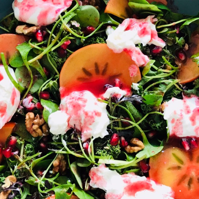 Zum Schluss aus dem Granatapfelsaft, etwas Salz und Olivenöl ein fruchtiges Dressing mixen und über dem Salat verteilen.