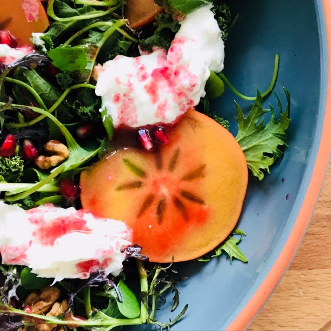 Nun Persimone gut waschen und in feine Scheiben schneiden. Diese anschliessend zusammen mit den Nüssen und den Granatapfelkernen auf dem Salat verteilen.