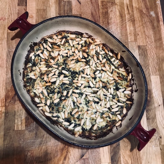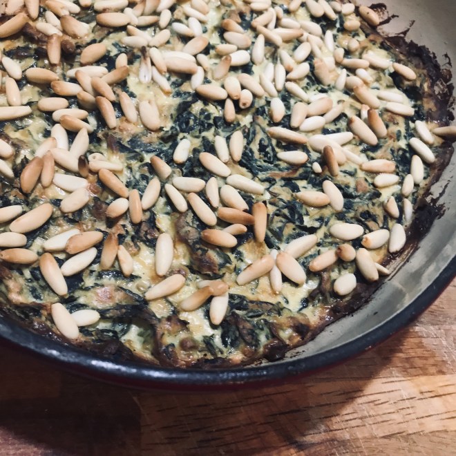 Die weichen Palmkohlblätter mit der Ricotta mischen und in ofenfeste Form geben, mit den Pinienkerne bestreuen und ca. 30 Minuten bei 160 Grad backen bis die Masse gestockt und die Pinienkerne goldbraun sind.