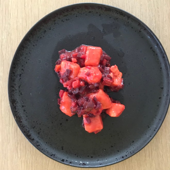 Die rote Beetenknolle und Karotten schälen und in kleine Würfel schneiden. Die Würfel salzen und in etwas Olivenöl bissfest dünsten.