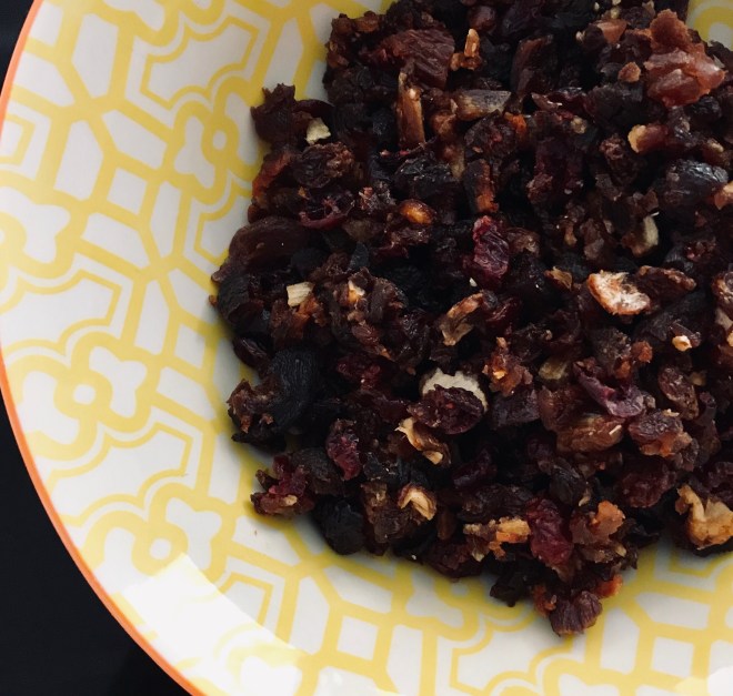 500 gr Trockenfrüchte (Feigen, Aprikosen, Datteln, Rosinen, Cranberries) und 1 Esslöffel Honig (optional)
