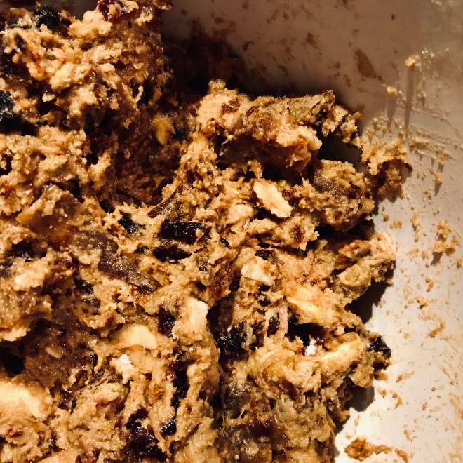 Anschliessend den Honig, die Eier, das Apfelmark sowie die Torckenfrüchte dazugeben und mit den Händen zu einem schweren Teig vermischen.