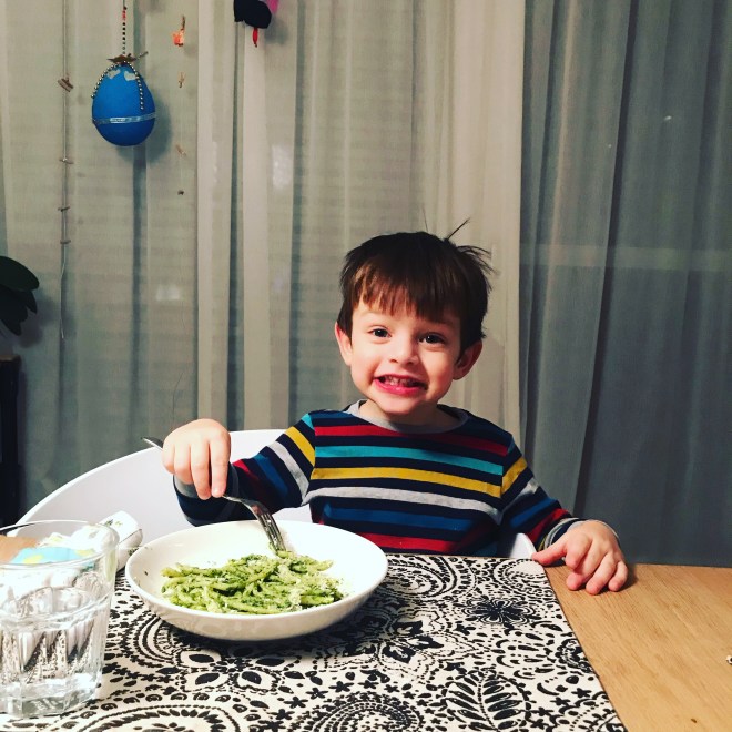 Die abgeseihten Trofie mit dem Pesto mischen und bei Bedarf soviel Pastakochwasser dazugeben damit die Pestosauce schön cremig wird.