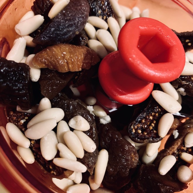 In einem Standmixer die tockenen Früchten und Nüsse zusammen mit dem Honig zu einer Masse mixen.