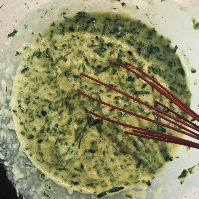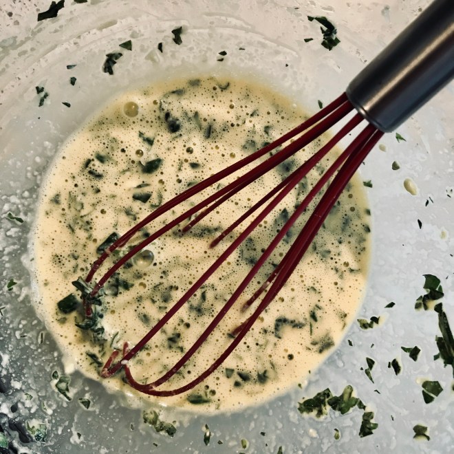 In einer Schüssel die Eier, den Frischkäse, den geriebenen Käse sowie die gehackten frischen Kräuter gut vermischen.