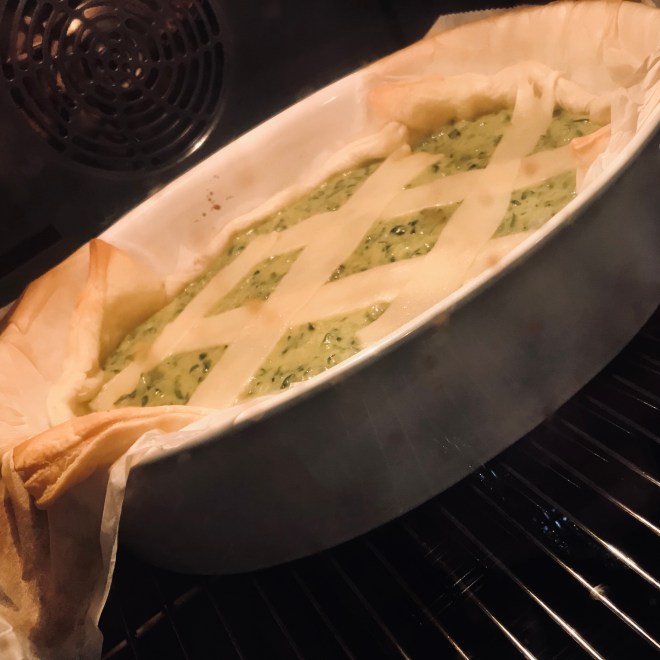 Zum Schluss die Zucchini dazugeben und in den blind gebackenen Blätterteig geben.