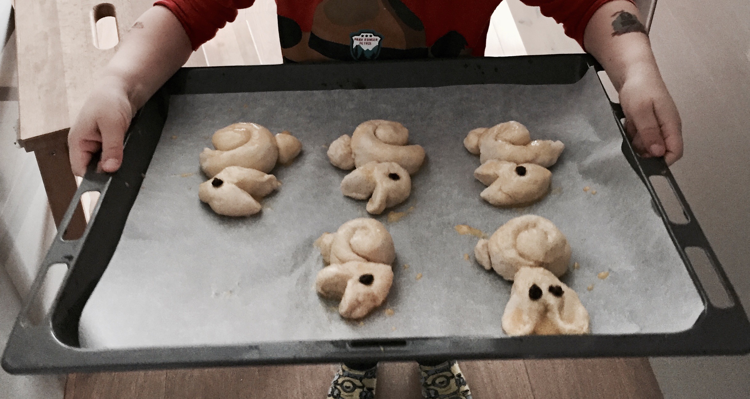 Für das „Gesicht“ eine grössere Teigkugel zu einen Tropfen formen und an der Spitzen Seite mit einer Schere einschneiden. Als Augen können Rosinen oder Schokodrops genommen werden.