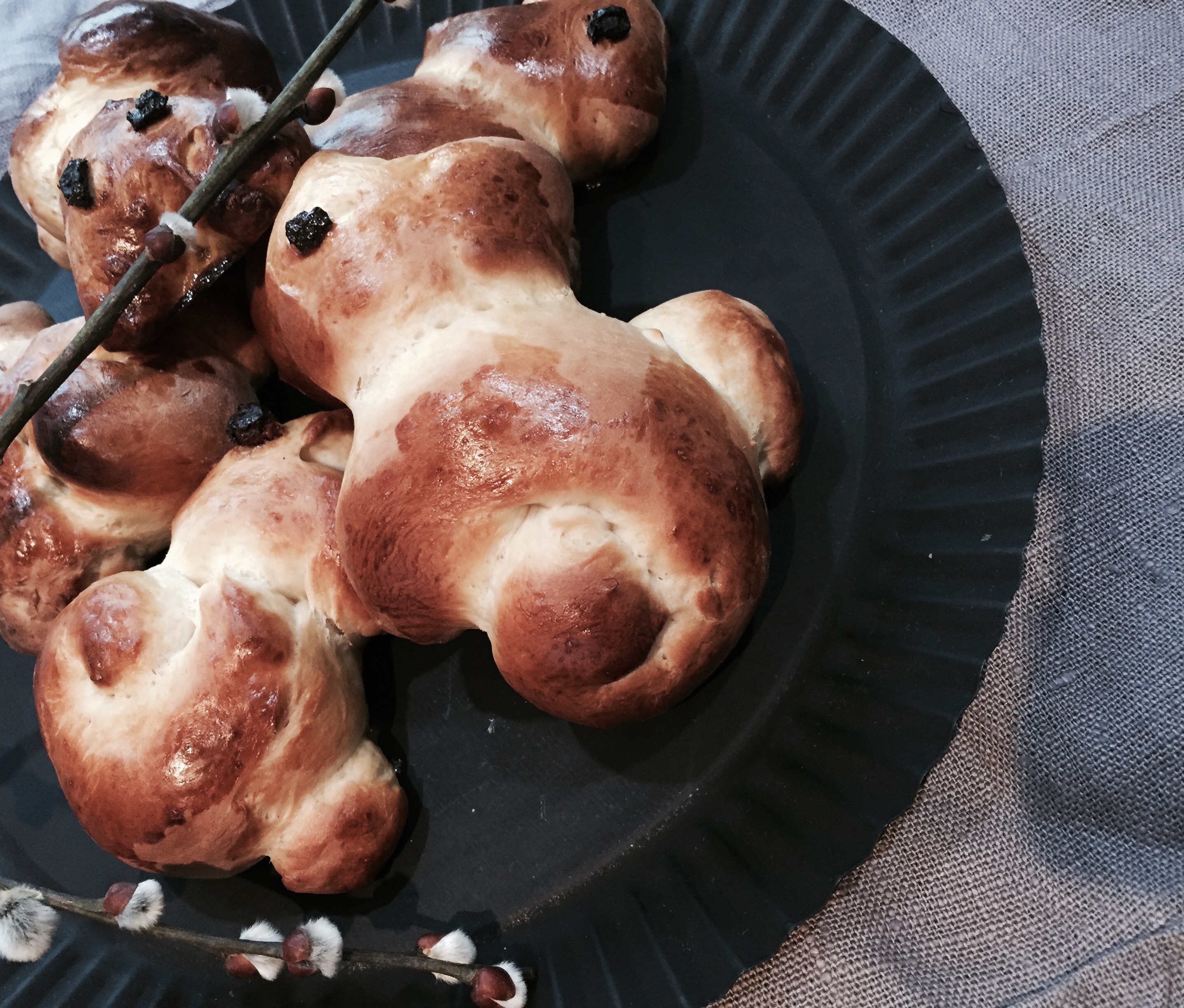 Die Hasen werden noch mit einem Ei (mit etwas Milch aufgeschlagen) bepinselt.