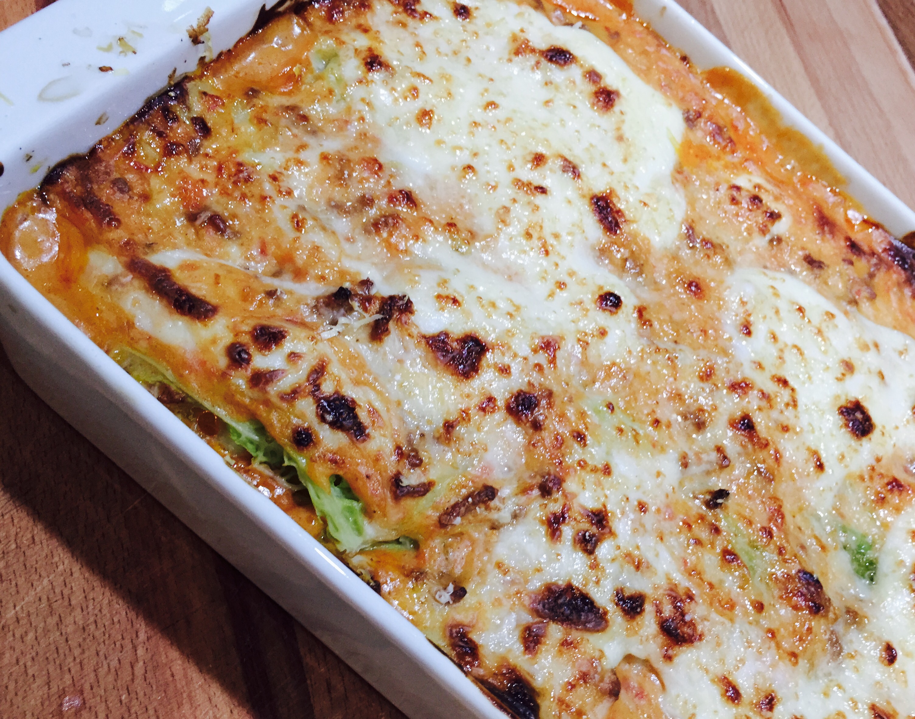 Nun 2 Kellen Sauce verteilen und wieder eine Schicht Wirsing legen. So weiter verfahren bis die Wirsingblätter und die Sauce aufgebraucht sind.