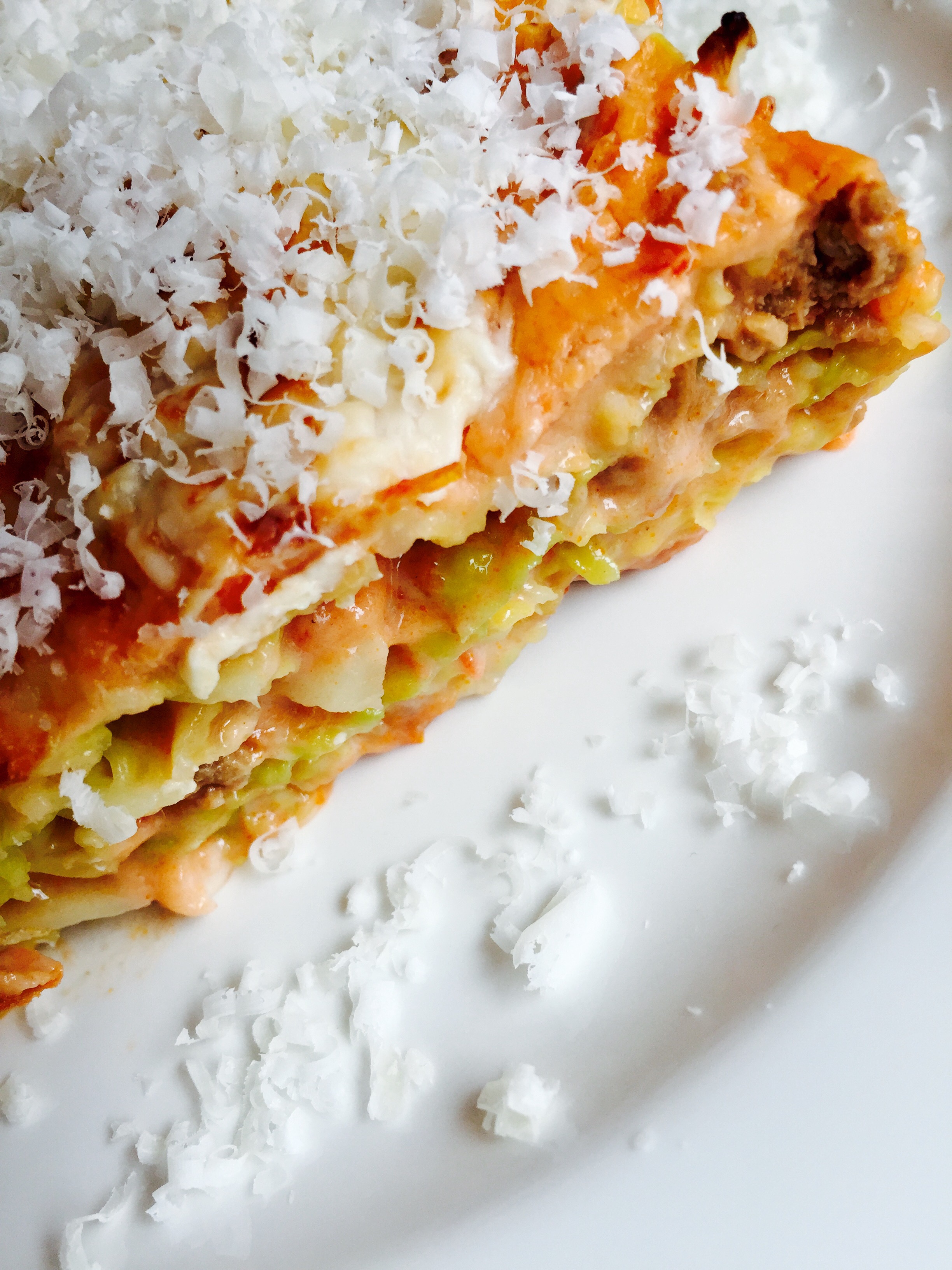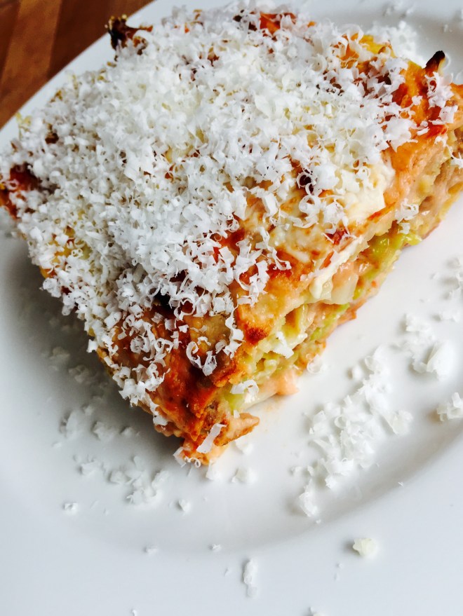 Die letzte Schicht muss aus Sauce bestehen, darauf noch eine handvoll Parmigiano streuen und bei 180 Grad Umluft ca. 20 Minuten garen.