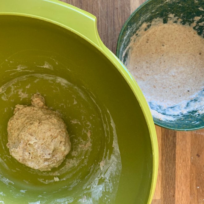 Für den Sauerteig also 50 gr aktives Weizenanstellgut mit 60 gr Weissmehl und 25 gr Wasser von Hand verkneten und 4 Stunden bei ca. 27°C reifen lassen.