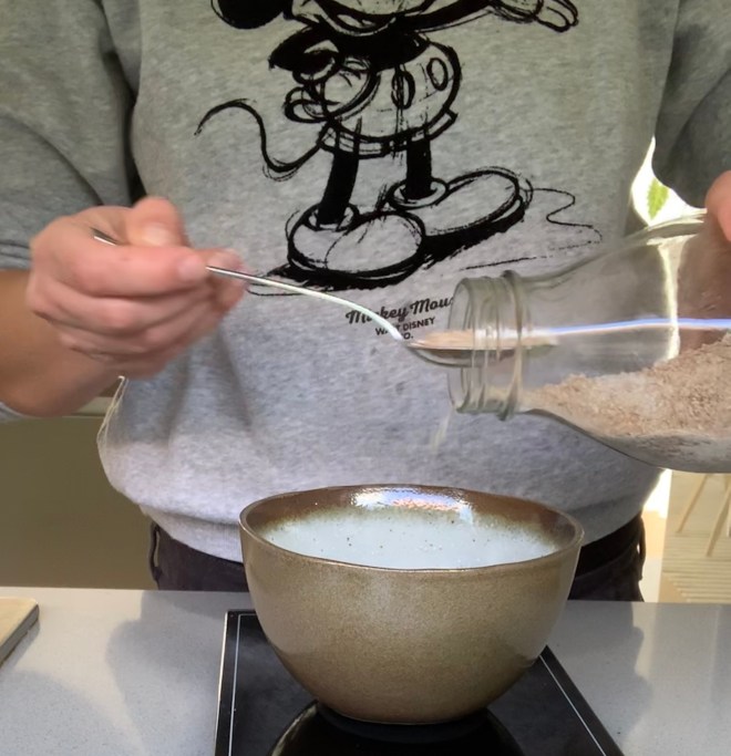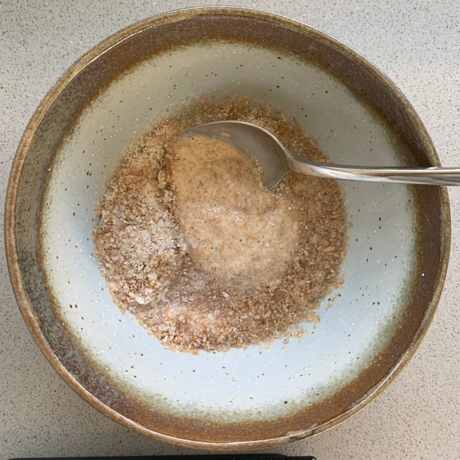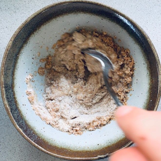 1. Tag: In einer kleinen Schüssel werden 50 gr Weizenvollkornmehl mit 50 gr Wasser vermischt und locker abgedeckt. Nach 12 Stunden wird die Masse einmal gut durchgerührt, sie wird sozusagen belüftet.