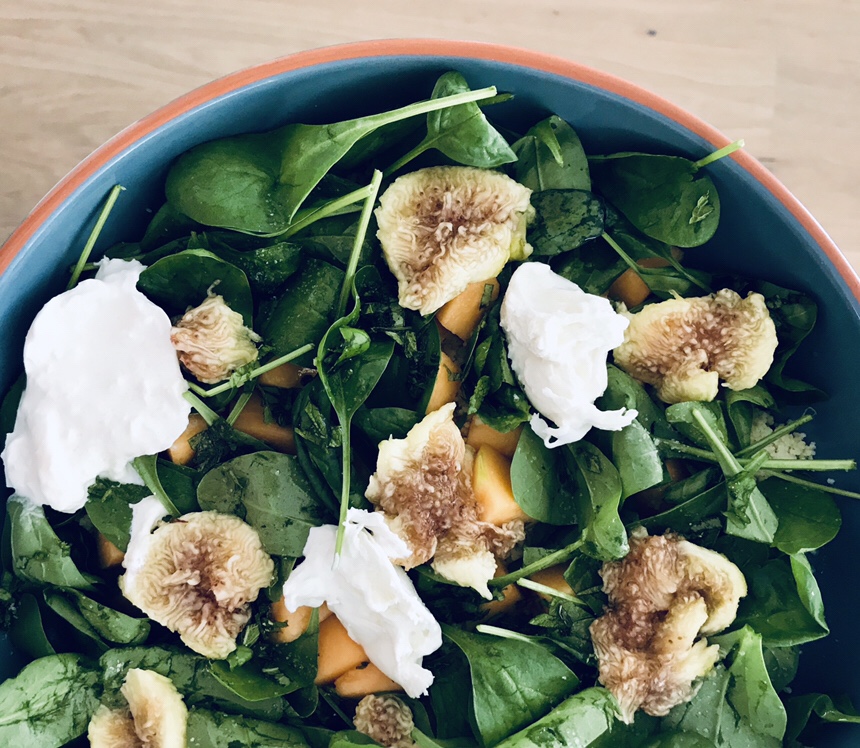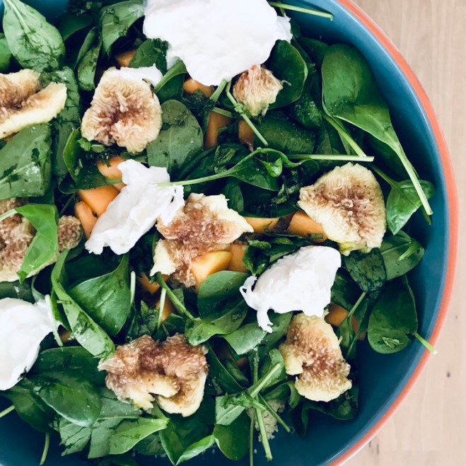 Den Couscous in eine weite Schüssel geben, den Spinat und die Feigen darauf verteilen.
