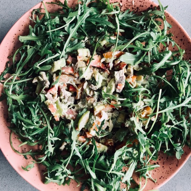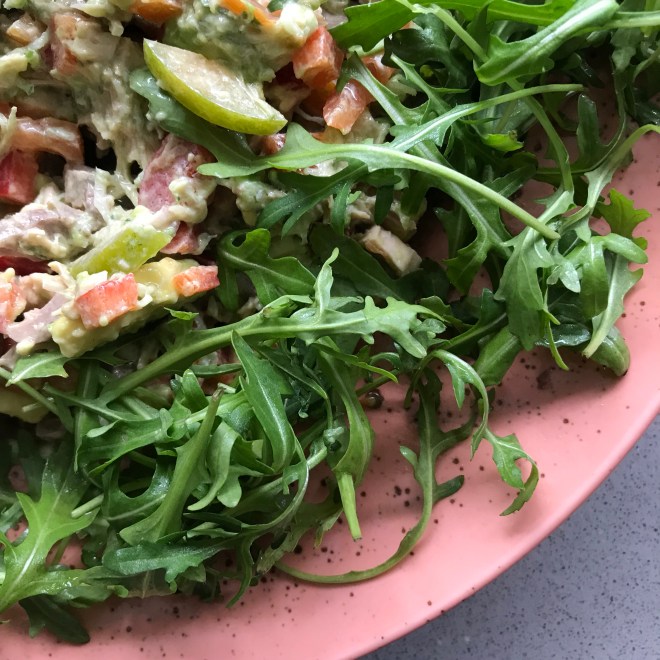 Die Marinade zu dem Gemüse und dem Hähnchen geben, mit Salz abschmecken. Zum Schluss die Ruccola dazugeben.