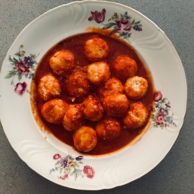 In der Zwischenzeit die Zwiebel kleinschneiden und in etwas Olivenöl weichdünsten, die Ricottabällchen dazugeben und rundherum vorsichtig goldbraun braten.
