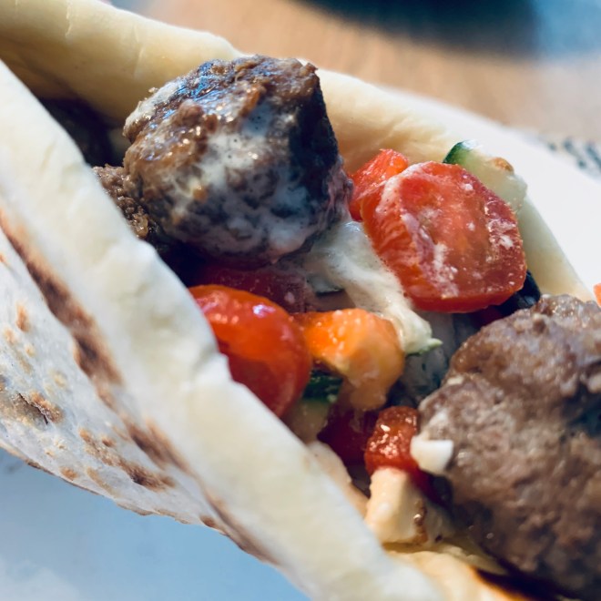 Die Hackfleischbällchen schmecken prima zu der griechischer Salsa und zum Tzatziki. Damit fülle ich Pitabrote oder auch hausgemachtes Naanbrot.