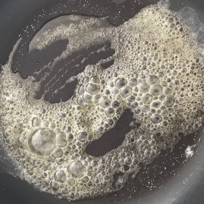 In einer Pfanne 1 Teelöffel Zucker in etwas Butter (ca. 1/2 Esslöffel) karamellisieren.