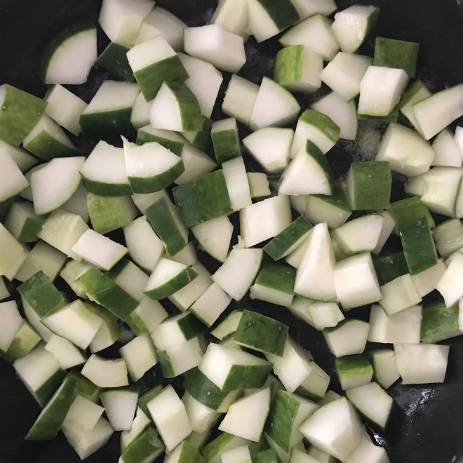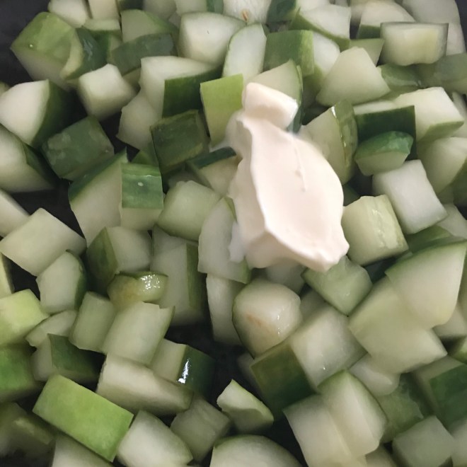 Anschliessend die in Stücke geschnittene Gurke dazugeben und leicht salzen.