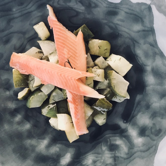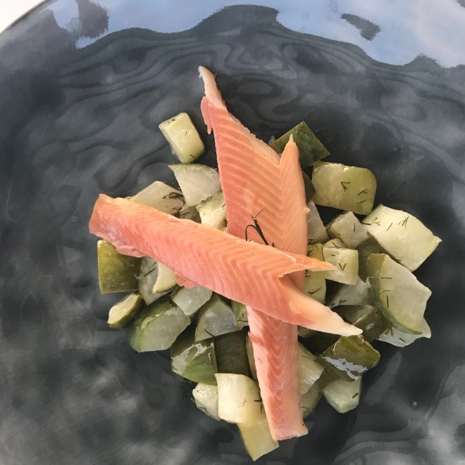 Nach 5 Minuten die Creme Fraîche unterrühren und solange weiter köcheln bis die Gurke weich aber immer noch biss hat. Zum Schluss mit etwas gehackten Dill verfeinern.
